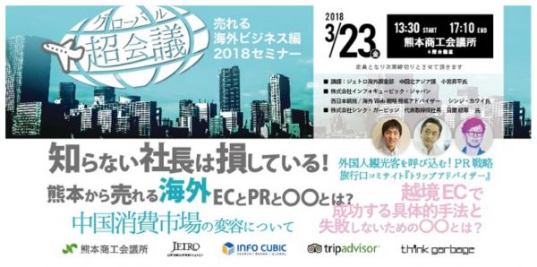 「グローバル超会議売れる海外ビジネス編2018セミナー」 は、熊本商工会議所が主催する海外ビジネスの糸口を掴んでいただくための具体的な手法である“越境EC”や “インバウンド取り込み”として活用できる旅行クチコミサイトについて、具体的事例を交えて説明する中小企業向けのビジネスセミナーです。