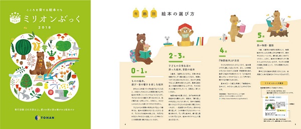 新たな商品が加わり、112点となったミリオンぶっくを紹介したパンフレットは、子どもに絵本を選ぶ8つのシーンを想定して構成。各シーンの発行部数最多銘柄には出版社へ届いた読者ハガキを元にした「先輩VOICE」を掲載、読み終わった商品にチェックをつける「読んだよ」マーク、「年齢別・絵本の選び方」(協力・福音館書店)、人気絵本誕生の歴史をたどる特集コラム(協力・白泉社)など、親子で絵本を身近に感じてもらう工夫が詰まっています。