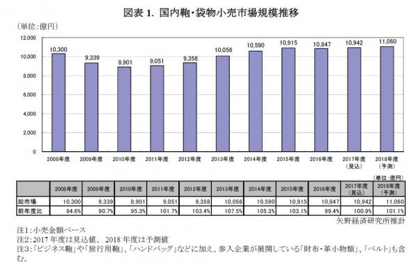 ◆2016年度の国内鞄・袋物市場規模は前年度比99.4%の1兆847億円、