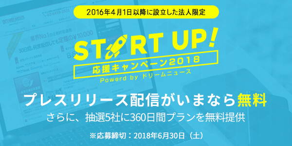 プレスリリース配信代行サービス『ドリームニュース』を運営するグローバルインデックス株式会社は、2018年4月2日、設立が2016年4月以降の法人企業を対象とした、プレスリリースを1回無料で配信できる『スタートアップ企業応援キャンペーン2018』(http://www.dreamnews.jp/campaign/2018/)を開始しました。