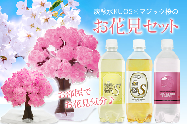 株式会社OTOGINO(オトギノ:代表取締役社長 鬼武公洋 本社 大分県日田市北友田 2 丁目 2123 番地 1)がECサイトにて販売している、この季節大人気の魔法の水をかけると6~12時間で咲く不思議な桜「マジック桜」と、ビールやハイボールの香りでお酒気分を味わえる炭酸水や、ほんのりピンク色で気分を盛り上げるグレープフルーツの香りの炭酸水など、お好きな炭酸水が選べる「KUOS(クオス)フレーバー」がセットになった『お花見セット 2018年度版』を2018年3月26日より販売開始致しました。