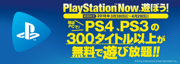株式会社ランシステム(東京都豊島区、代表取締役社長:日高大輔)は、運営する複合カフェ「スペースクリエイト自遊空間(以下、自遊空間)」の関東16店舗にて、株式会社ソニー・インタラクティブエンタテインメント(以下、SIE)が提供するクラウド技術を活用したストリーミングゲームサービス「PlayStation Now(以下、PS Now)」を2018年3月30日(金)から4月29日(日)までの期間限定でサービス提供いたします。