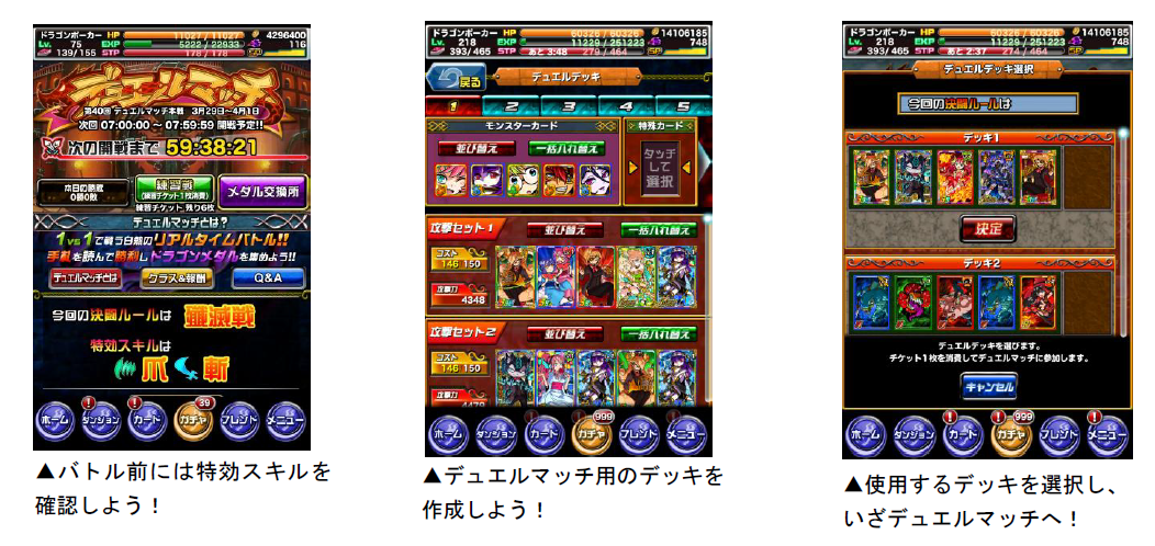 デュエルマッチでは、通常よりも高い効果を発揮する「特効スキル」が設定されています。今回の「デュエルマッチ」の特効スキルは、爪・斬です。特効スキルのカードをデッキに入れて、有利にバトルを勝ち進めましょう。