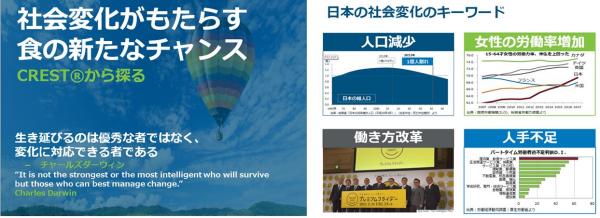 ファベックス2018の「外食・中食マーケットデータ展示コーナー」では、外食・中食市場における消費者の食志向や動向の調査レポートを展示します。昨年に引き続きまして、エヌピーディー・ジャパン株式会社が調査レポートを提供、協力いたします。今回のレポートのテーマは、「社会変化がもたらす食の新たなチャンスをCREST(R)から探る」です。人口減少、女性の労働力率増加、働き方改革、人手不足の4つの社会変化が、外食・中食市場に与える影響を分析したレポートです。