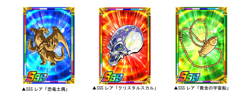 今回は新たに3つの限定子分カード「恐竜土偶」「クリスタルスカル」「黄金の宇宙船」が登場!限定子分カードは、SPスキル「カード化UP」でカード化可能です。また、稀に宝箱から出てくることもあります。