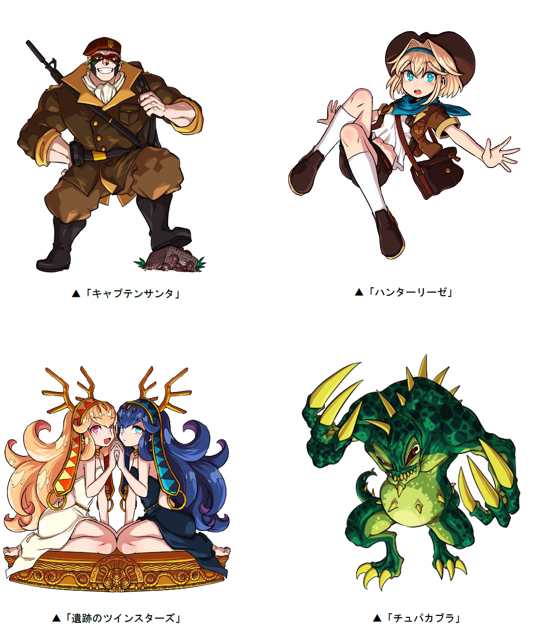 本ダンジョンでは「ハンターサンタ」「ハンターリーゼ」「遺跡のツインスターズ」のいずれかが1戦目に出現します。仲間と一緒に協力して強敵たちに挑みましょう!また、2戦目には稀に「チュパカブラ」が登場する事があります。