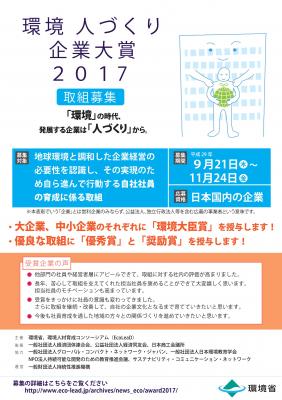 環境省、環境人材育成コンソーシアム(EcoLeaD)主催の「環境 人づくり企業大賞2017」は、地球環境と調和した企業経営を実現するため、環境保全や社会経済のグリーン化を牽引する人材、すなわち環境人材を自社で育成するための優良な取組を行う企業を表彰するものです。