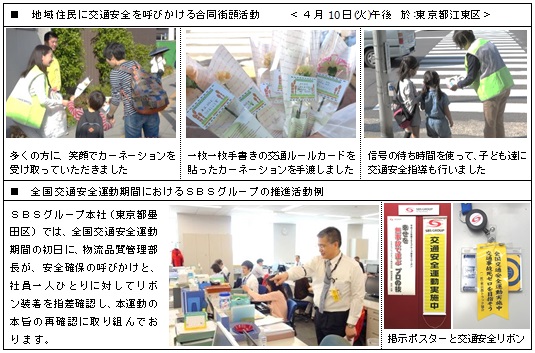 全国交通安全期間中、SBSグループでは本社および全国の事業所で啓発ポスターや垂れ幕を掲示したり、全従業員に「交通安全リボン」を装着させて業務時間だけでなく日常生活でも交通安全を意識して行動することを呼びかけております。