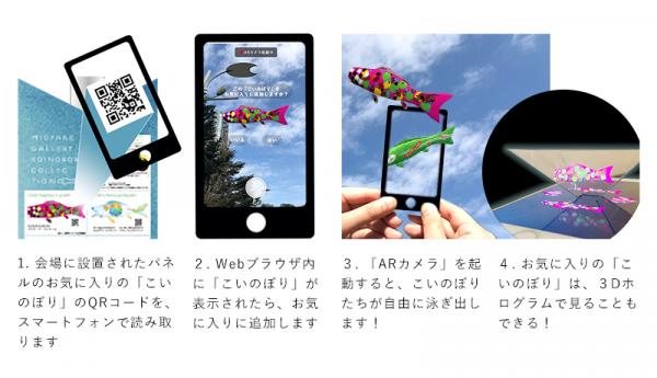 会場に設置されたこいのぼりの紹介パネルに掲載されているQRコードをスマートフォンで読み取ると、Webサイト上にお気に入りのこいのぼりを集めた自分だけのコレクションが生成されます。そして、スマートフォンの画面をWebRTC技術*を用いた「ARカメラ」モードに切り替えることで、まるでスマートフォンの中にこいのぼりが飛び込み、自分のまわりを泳いでいるかのようなAR体験を実現しました。さらに、その光景を写真に撮ることもできます。