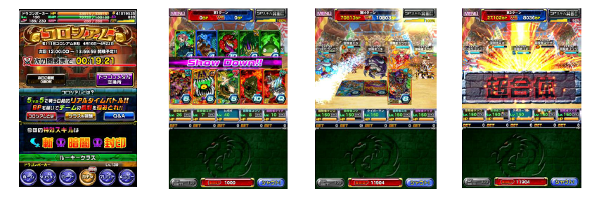 コロシアムのバトルは、5人vs 5人で1人1枚ずつカードを出して役勝負をします。より強い役を作ったチームが先攻となり、相手チームへ攻撃を行います。攻撃時に与えたダメージはBPとして加点され、5ターン終了後、合計BPが多いチームが勝利となります。