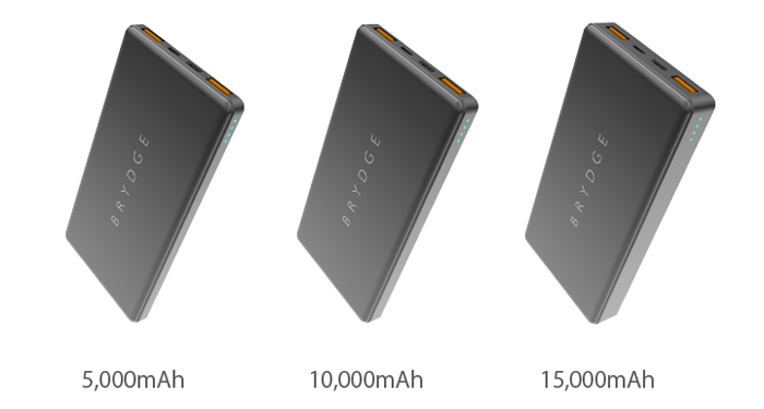 BRYDGE PORTABLE BATTERYは、Quick Charge 3.0対応のモバイルバッテリーです。USB×2出力、USB Type-C×1入出力、Micro USB×1入力を備え、スマートフォンやタブレット、WiFiルーターなどのモバイル製品の充電に最適です。耐久性に優れた軽量アルミニウムボディを採用、バッテリー残量が分かるLEDインジケータを搭載、5,000mAh、10,000mAh、15,000mAhの3ラインアップ。