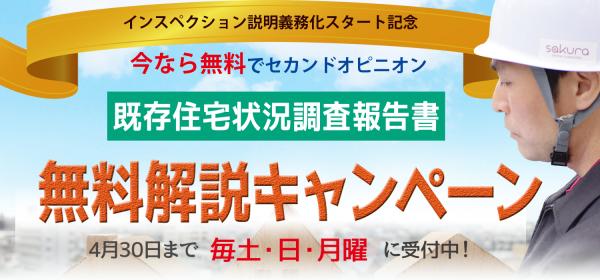 業界初の個人向け総合不動産コンサルティング・ホームインスペクション(住宅診断)を行う“不動産の達人 株式会社さくら事務所”(東京都渋谷区/代表:大西倫加)はインスペクション説明義務化スタートを受けて、4/14~4/30までの土・日・月曜限定で「既存住宅状況調査報告書」を実績豊富なホームインスペクターたちが無料で解説するキャンペーンを実施しています。