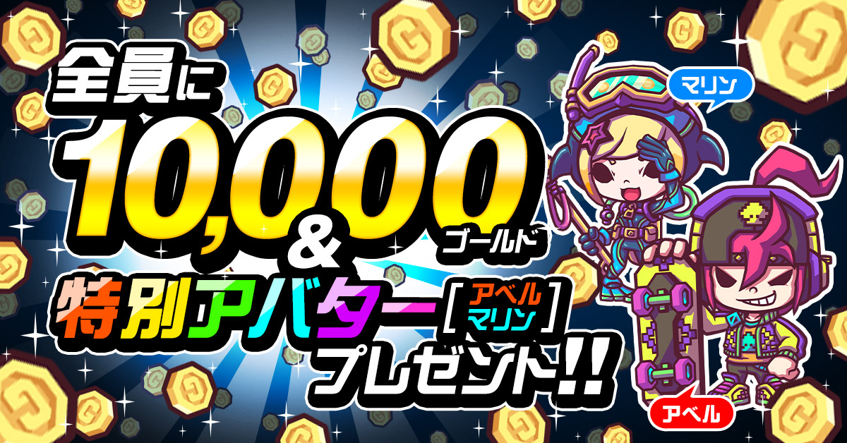 合計10,000 ゴールドと特別アバター2体(アベル・マリン)