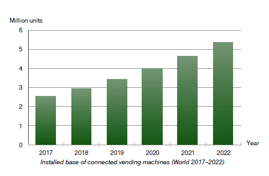 スウェーデンの調査会社ベルグインサイト社(Berg Insight)の調査レポート「ネットワーク型自動販売機(第3版)」は、世界のネットワーク型自動販売機市場を調査している。世界には現在約1600万の自動販売機があり、オペレータの多くがネットワーク接続性の付加を検討している。ベルグインサイト社は、世界のネットワーク接続性を有する自動販売機の数は2017年の260万から年平均成長率(CAGR)16.2%で成長して、2022年には540万に達するだろうと予測している。予測期間中内には普及率は32.2%に達するだろう。ベンダ、製品、市場に関する最新の情報を提供している。