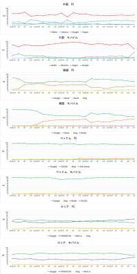 前回調査から比較しても韓国「Google:-9.8%」「Naver:+3.6%」(PC)・「Google:-7.9%」「Naver:+7.2%」(モバイル)、中国「Baidu:-32.9%」「Shenma:+31.6%」(モバイル)、ロシア「Google:-5.3%」「YANDEX RU:+6.7%」(PC)、「Google:-5.4%」「YANDEX RU:+5.7%」(モバイル)と、主要検索エンジンのシェアが減少し、独自の検索エンジンのシェアが増加している傾向にあります。