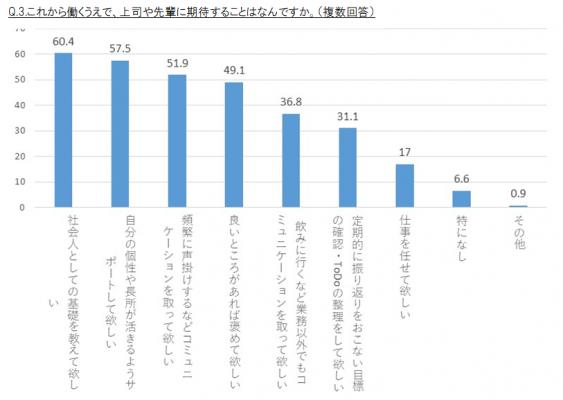 またこれは、上司や先輩に期待することの結果にも表れており、上位に「自分の個性や長所が活きるようサポートして欲しい」「頻繁に声掛けするなどコミュニケーションを取って欲しい」がランクイン。自分から行動するよりは、自分のことを分かって欲しい、サポートして欲しいというのが伺えます。