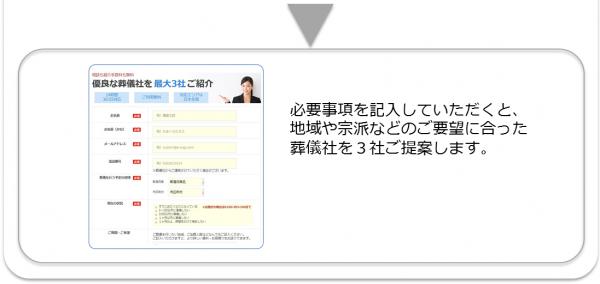 同上の調査によると、「没後2時間未満に葬儀社を決めた方」が50.0%となっており、葬儀社の決定には長い時間を割くことができません。ご利用者がチャット内で項目を選択していくと、「いい葬儀」では地域や宗派などのご要望に合った3つの葬儀社をご提案します。これにより、ご利用者の時間的負担を軽減します。