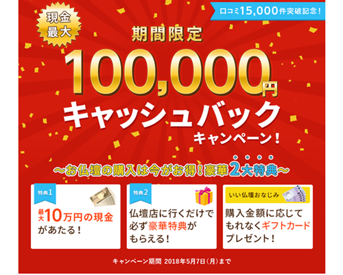 「いい仏壇」口コミ15,000件突破記念、抽選で現金最大「100,000円」キャッシュバックお客様感謝キャンペーン