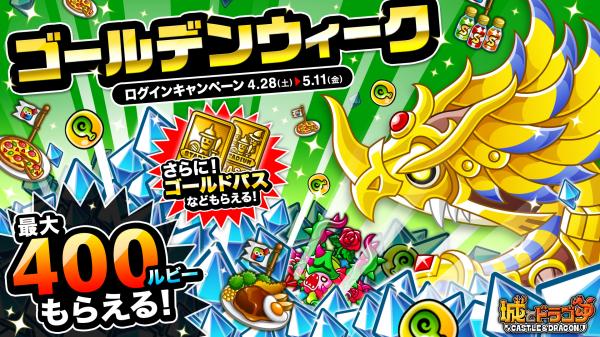 4月28日(土)より、期間中にログインするだけで、ゴールドパスや400ルビーなどのレアアイテムがもらえる「ゴールデンウィークログインキャンペーン」を開催いたします。また、ステージごとに決まったキャラで討伐イベントへ参加する「城ドラチャレンジカップGW」も開催いたします。ゴールデンウィークもイベント盛りだくさんの『城とドラゴン』をお楽しみください!
