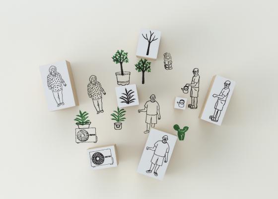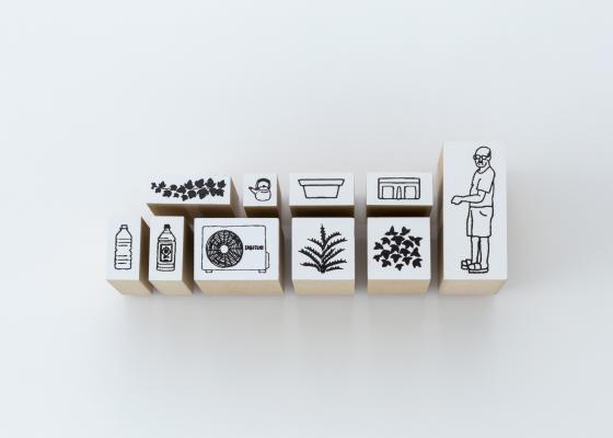 「家ンゲイはんこ」は、プランター、ペットボトル、アロエ、サボテン、小人の置き物、牛乳瓶ケース、選挙ポスターなど、下町の園芸空間を彩る「あるある」パーツをはんこ化し、自由に組み合わせることで、紙の上で路上園芸を疑似体験できるキットです。