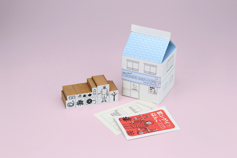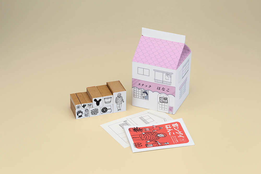 ポストカード(1枚)・はんこ(10点)・ミニ解説書・家屋型パッケージ箱