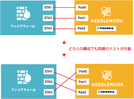 このように、NEEDLEWORK自体が持つテスト用ポートのIPアドレス設定が不要になったことで、NEEDLEWORK側のポートアサインを考慮する必要がなくなり、テスト対象ファイアウォールと任意のポートで接続するだけでテストを行えます。