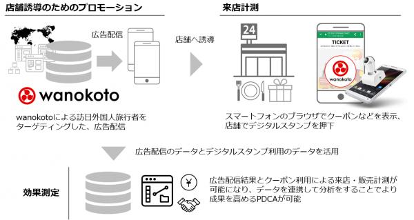 デジタルマーケティングを支援する、株式会社アイ・エム・ジェイ(本社:東京都港区 取締役社長兼 CEO:黒川 順一郎以下、IMJ)は、自社が提供している訪日外国人旅行者を対象にしたインバウンド特化のマーケティング支援サービス「wanokoto」と、NECネッツエスアイ株式会社(本社:東京都文京区代表取締役執行役員社長:牛島 祐之)のスマートフォン向けデジタルスタンプサービス「PlusZone/Stamp(プラスゾーン・スタンプ)」(注)とを連携し、訪日外国人旅行者を対象としたリアル店舗への来店を促すO2Oソリューション「wanokoto Store Visit」の提供を開始したことを2018年5月9日に発表いたしました。
