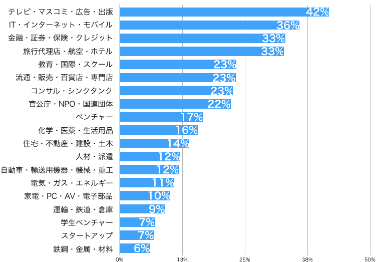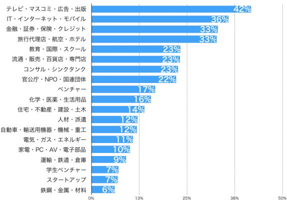 志望業界は「テレビ・マスコミ・広告・出版」業界が42%の支持で1位となりました。2位に「IT・インターネット・モバイル」業界、その次に「金融・証券・保険・クレジット」「旅行代理店・航空・ホテル」業界が続いています。