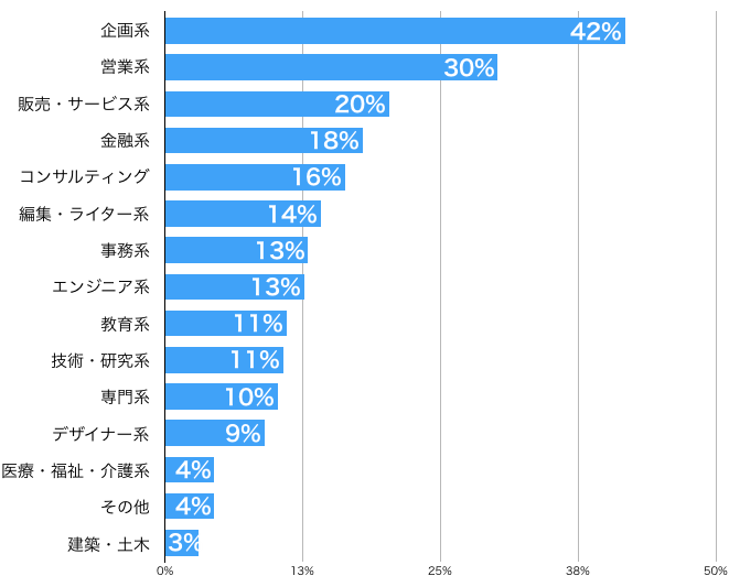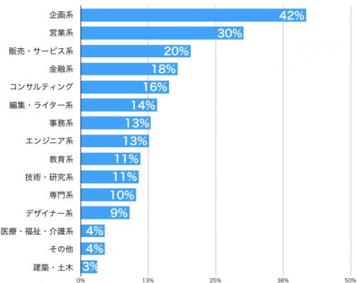 他の就職ランキングでは中々現れない「編集・ライター系」が約14%、「デザイナー系」職種が約9%いることは特徴的な数値として出ています。