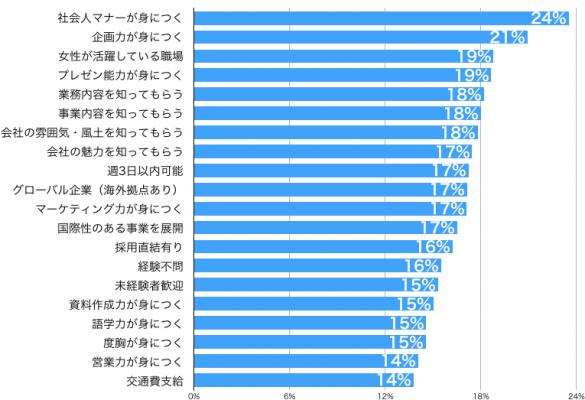 また、志望職種1位の「企画系」を反映して「企画力が身につく」が21%の支持を受けて2位、女性の登録が多いこともあり「女性が活躍している職場」が約19%で3位になっています。