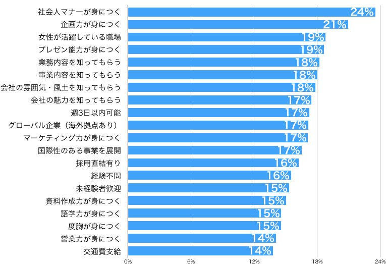 僅差ではありますが「~が身につく」よりは「~を知ってもらう」という項目が上位にあがってきており何を身につけるか?よりもまずは「会社で働くということはどういうことか?」を知りたいという要望が分かる結果となっています。