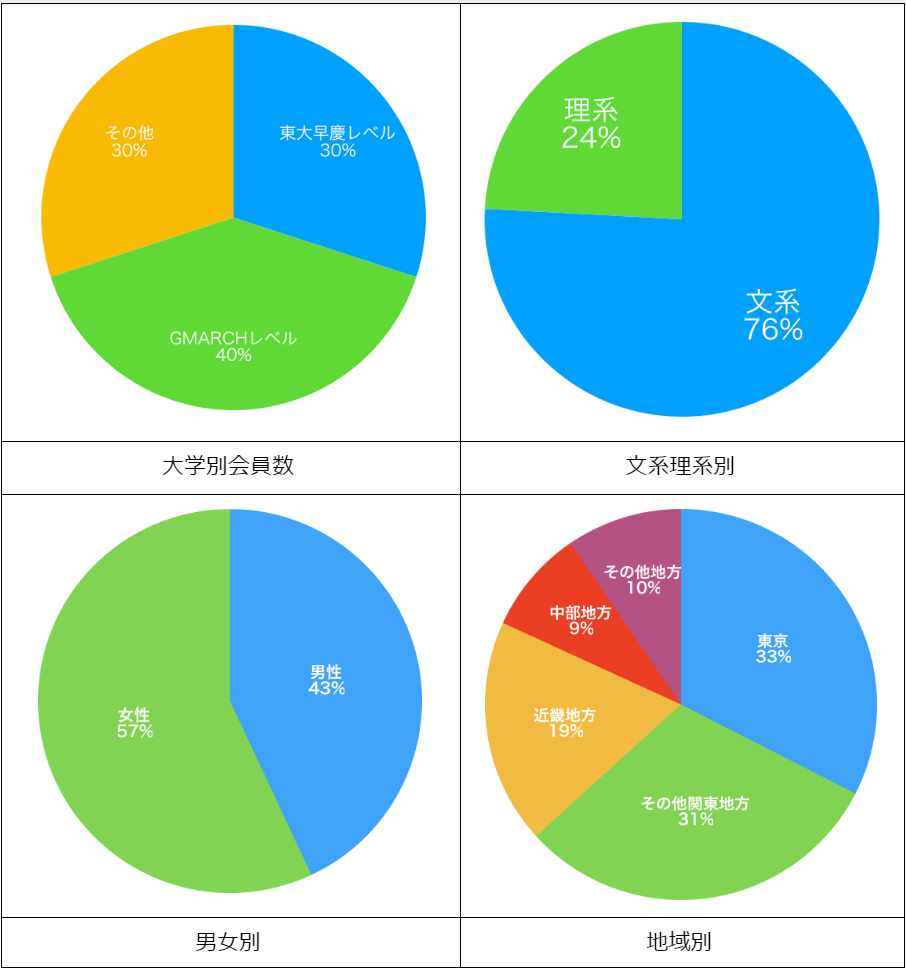 難関・国立私立大学である東京大学・早稲田大学・慶應義塾大学層の学生が全体の約3割となり、GMARCH層の学生が4割、その他の大学層は約4割となっています。