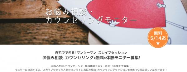 今回は、なかなか実生活では相談できない「悩み」を解決する場を、スカイプを利用したオンラインセッションとして提供している、「お悩み相談・カウンセリング」カテゴリのレッスンを対象に、無料受講モニターの募集を開始いたします。