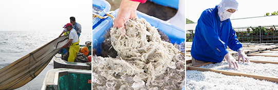 「踊り炊き釜揚げしらす」は、スピーディーさが美味しさの要です。しらすを市場でセリ落とすと同時に、市場から数分の所にある工場へと連絡を入れます。即座に、工場では釜茹での準備を始め、しらすが到着すると同時に加工作業に入ります。しらすが水揚げされてから釜茹でにするまでの所要時間は約10分というから驚きです。厚釜でしらすを躍らせるように茹でることで、ふんわり、ぷりぷりの食感になります。