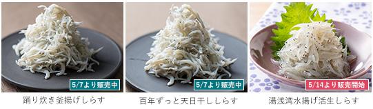 「湯浅湾水揚げ活生しらす」(50g・税込626円・5/14より販売開始)の3商品です。