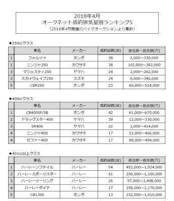 情報流通支援サービスの株式会社オークネット(本社:東京都港区/社長:藤崎清孝)は、2018年4月度のオークネットバイクオークションにおける成約台数を集計し、排気量別ランキングベスト5をまとめました。