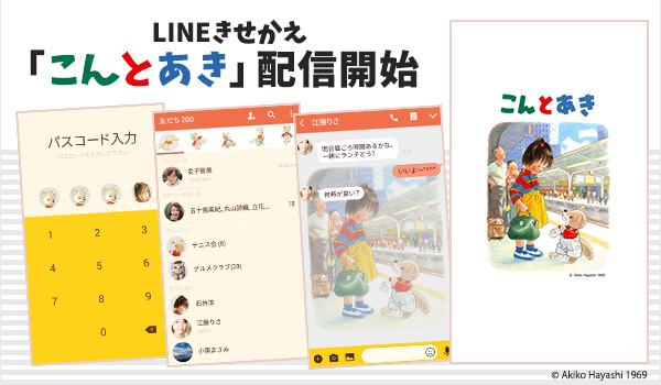 第1弾の「ねないこだれだ」と第2弾の「いやだいやだ」に続き、絵本シリーズ第3弾として長年愛されている「こんとあき」がLINE着せかえに登場!ぬいぐるみ「こん」の腕がほころび、おばあちゃんに直してもらうため、女の子「あき」と「こん」が汽車に乗って旅に出る絵本です。絵本の表紙をトーク画面の背景にできるので、まるで絵本を取っているような感覚になります。森明子さんのかわいくて温かみのあるイラストが満載な着せかえとなっています!