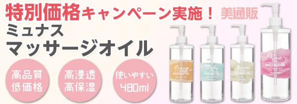 そこで美通販では、コストも安く、防腐剤フリーのマッサージオイル『ミュナス マッサージオイル』(株式会社レイナカンパニー) をピックアップしキャンペーンを行うことを決定いたしました。