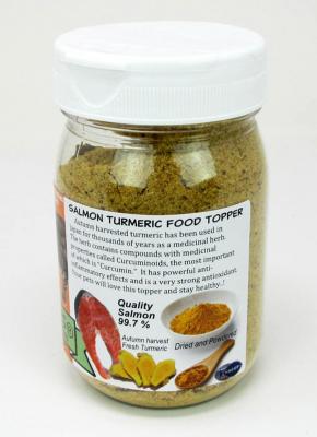 サーモン99%に秋ウコンをブレンド。ペットが毎日ペットフードにかけて秋ウコンを食べられるように配合。商品は無添加でグルテンフリー。ドッグフードへふりかけても、キャットフードへふりかけても相性は抜群。It is Grind dried salmon 99% & Autumn-harvested turmeric blended for daily use. This food topper is made without preservatives and additives, Grain free/Gluten free, and it is good for both Dogs & Cats.