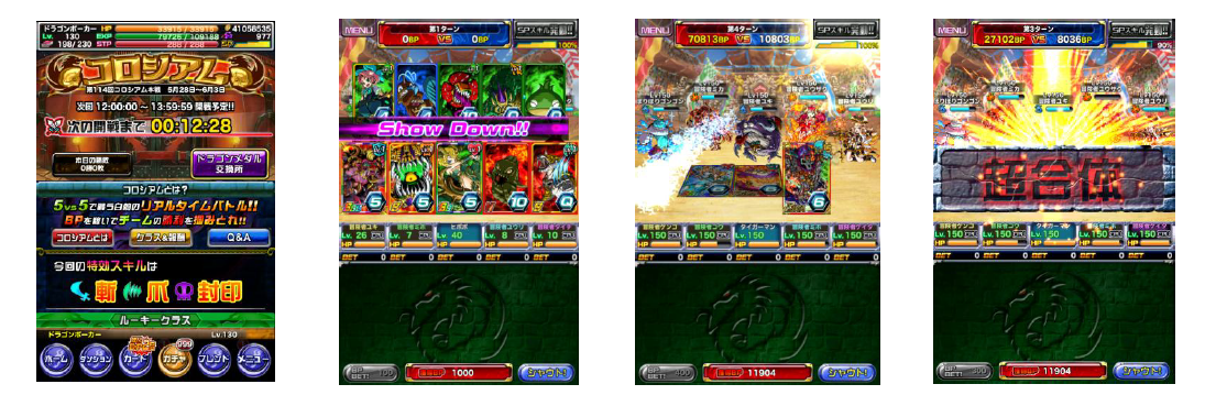 コロシアムのバトルは、5人vs 5人で1人1枚ずつカードを出して役勝負をします。より強い役を作ったチームが先攻となり、相手チームへ攻撃を行います。攻撃時に与えたダメージはBPとして加点され、5ターン終了後、合計BPが多いチームが勝利となります。