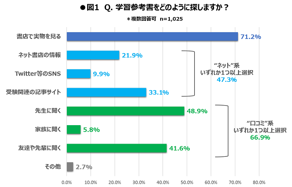 高校生が学習参考書を探す方法として最も多かった回答が、「書店で実物を見る」(71.2%)でした。書店まで足を運んで実際に書籍を手に取り、自分の目で利用する参考書を選ぶといった方法が、スタンダードであることがわかります。