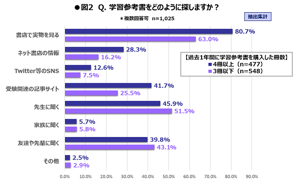 同じ質問を、回答者が過去1年間で購入した学習参考書の冊数をもとに切り分けたデータで見てみると、購入冊数が多い高校生ほど、「書店で実物を見る」(80.7%)割合が、より高い結果となりました。このほか、「受験関連の記事サイト」(41.7%)、「ネット書店の情報」(28.3%)など、インターネットを利用した探し方の回答割合も総じて高くなっており、幅広い情報に触れる機会の多さと、高校生が学習参考書を購入する冊数に相関があることがわかりました。(図2)