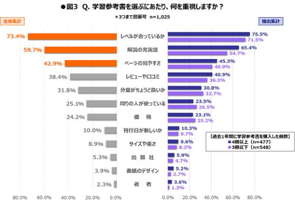特に「解説の充実度」については、過去1年間に参考書を「4冊以上」購入した高校生の抽出集計データでも、高い回答比率が示されており、体裁や価格よりも、内容面に重きが置かれている傾向が見て取れます。(図3)