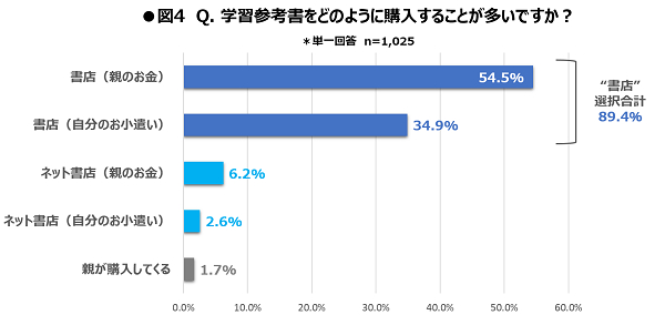 一方、ネット書店での購入割合は1割以下にとどまりました。インターネット上の情報を参考にしつつも、高校生自身がネット書店で学習参考書を購入するケースは少ないことがわかります。(図4)
