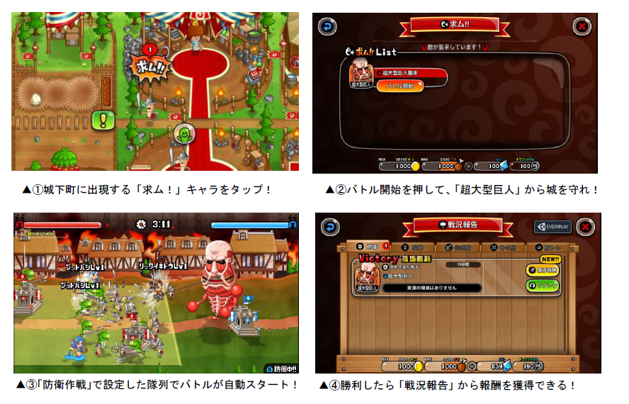 『城とドラゴン』に突如現れた「超大型巨人」の駆逐を目指すコラボ襲来イベント「超大型巨人襲来」を開催いたします。コラボ期間中、1日1回、プレイヤーの城に突如「超大型巨人」が攻めてきます。「超大型巨人」が出現した際は、城下町に「求ム!」キャラが登場し、プレイヤーにお知らせしてくれます。襲来イベントは「防衛作戦」を使用して「超大型巨人」を自動で迎え撃ち、勝利すれば報酬が獲得できますので、襲来に備えて防衛隊列を整えましょう!また、襲来イベント時は「進撃の巨人」マップとなり、コラボ限定キャラ「調査兵団」の攻撃力が上昇します。