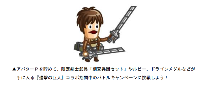 2018年6月1日(金)0:00より、TVアニメ『進撃の巨人』との復刻コラボイベントを開催いたします。コラボ期間中でしか手に入らない限定キャラ「調査兵団」もEGGショップに再登場!「調査兵団」はエレンやミカサ、リヴァイなどの『進撃の巨人』に登場するキャラクターにお着替えが可能です。また、今回のコラボイベントでは、コラボ剣士武具「調査兵団セット」が手に入るバトルキャンペーンも新たに開催いたします。その他にも、豪華報酬が毎日もらえるログインキャンペーンなども同時開催いたします。期間限定の夢のコラボをどうぞお楽しみください!