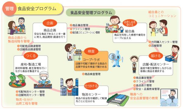 コープの商品だけでなく、提供するすべての商品を対象に生産から販売、その後の対応までの工程で「安全」のための努力を行っています。その核となるのが食品安全プログラムです。管理・基準・監視を柱に取扱い商品やサービスの安全管理及び品質管理の内容、ルール、手順を規定しています。