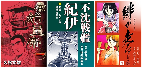 今回キャンペーン対象となるタイトルは、2018年4月の【コミック】ジャンルの電子書籍ダウンロード数ランキング(集計対象ストア:Kindleストア、楽天Kobo電子書籍ストア、Google Play、iBooks、Yahoo!ブックストア、SONY Reader Store)で1位に輝いた『秦始皇帝』(久松文雄=作画、久保田千太郎=原作)、2位の『不沈戦艦紀伊 コミック版』(神矢みのる=作画、子竜螢=原作)、3位の『緋が走る DX版』(あおきてつお=作画、ジョー指月=原作)の計3作品です。