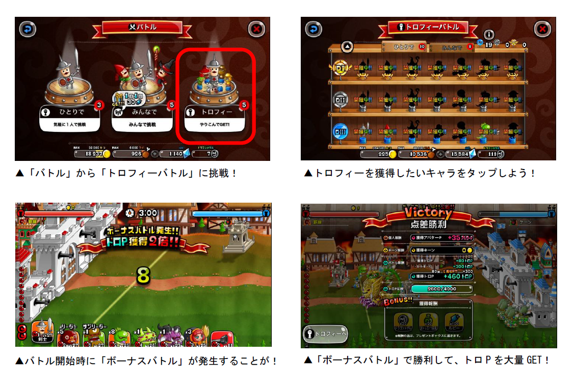 各キャラのトロフィーは、「トロP」を一定数貯めると獲得できます。トロPは「キャラのLvが20以上」「うまP200以上」など、各キャラによって異なる条件を満たした状態でバトルを行なうと獲得できます。また、バトルを開始すると「ボーナスバトル」が発生することがあり、バトルの勝敗に関係なく、獲得トロPが2・3・5・10倍のうちいずれかの倍率で増加します。ボーナスバトルが発生したら、勝利してトロPの大量獲得を目指しましょう!