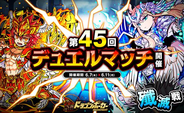 6月7日(木)より、1vs1のリアルタイム対人バトル「第45回デュエルマッチ本戦」を開催いたします。今回のルールは「殲滅戦」です。デュエルマッチでは、バトルで獲得できる「デュエルP」に応じてランキングが決まり、リーグ終了時に報酬が獲得できます。また、累計勝利数に応じて、限定カードも手に入ります。相手の心理を読み、1vs1の真剣勝負に挑みましょう!